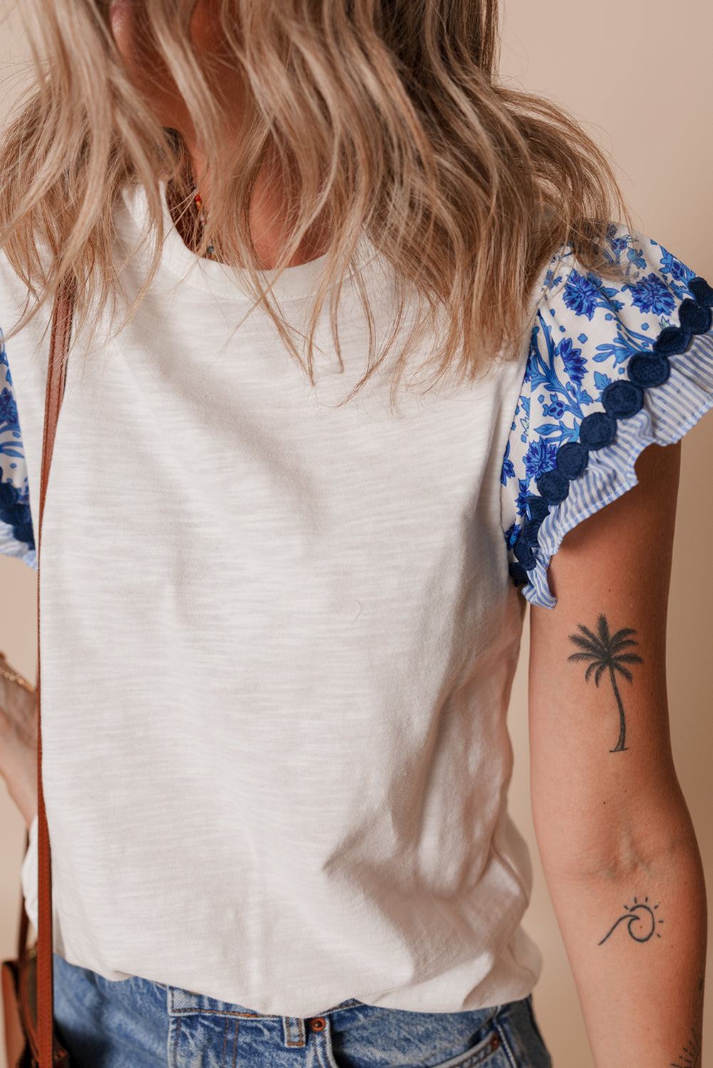 Blue Ricrac Trim Printed Flutter Sleeve Contrast Patchwork Blouse